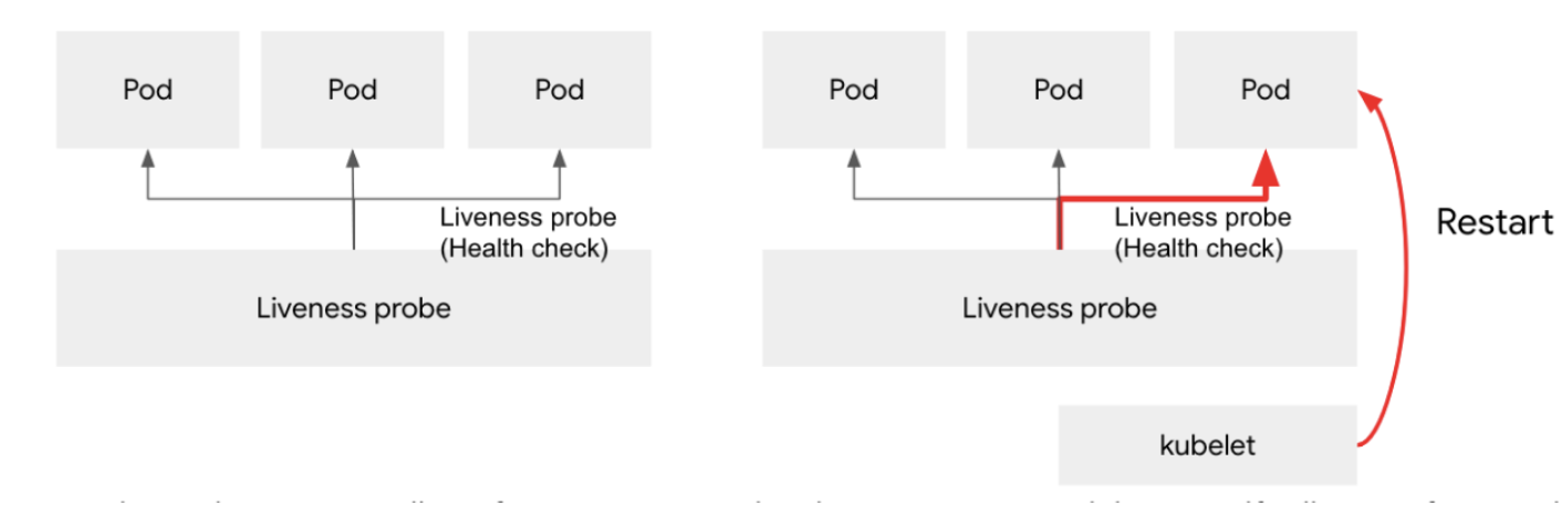 - Pod의 상태가 비정상인 경우 kubelet 통해서 재시작한다.