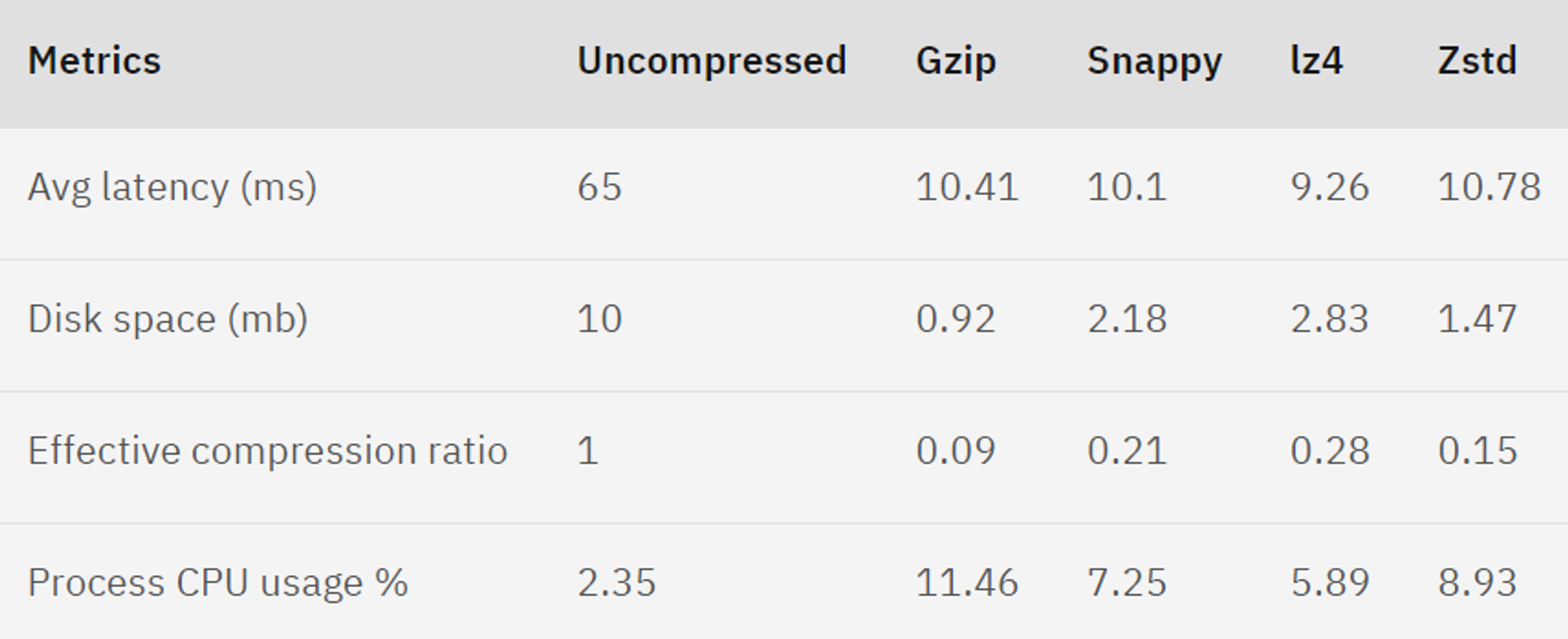 - 주로 사용되는 압축 알고리즘에는 Gzip, Snappy, LZ4 등이 있음